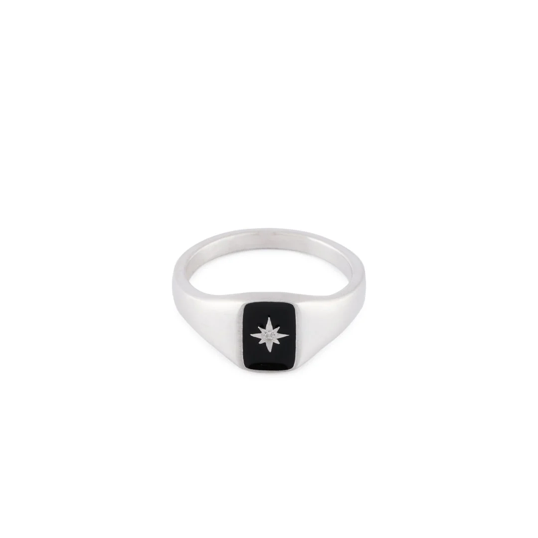 This ring is a geometric update to our bestselling Envy Ring. The face is a rectangular shape with black enamel & a cubic zirconia set in an 8 point star. The design was inspired by the idea of a black hole, an empty abyss with a bright star shining through the darkness.Â