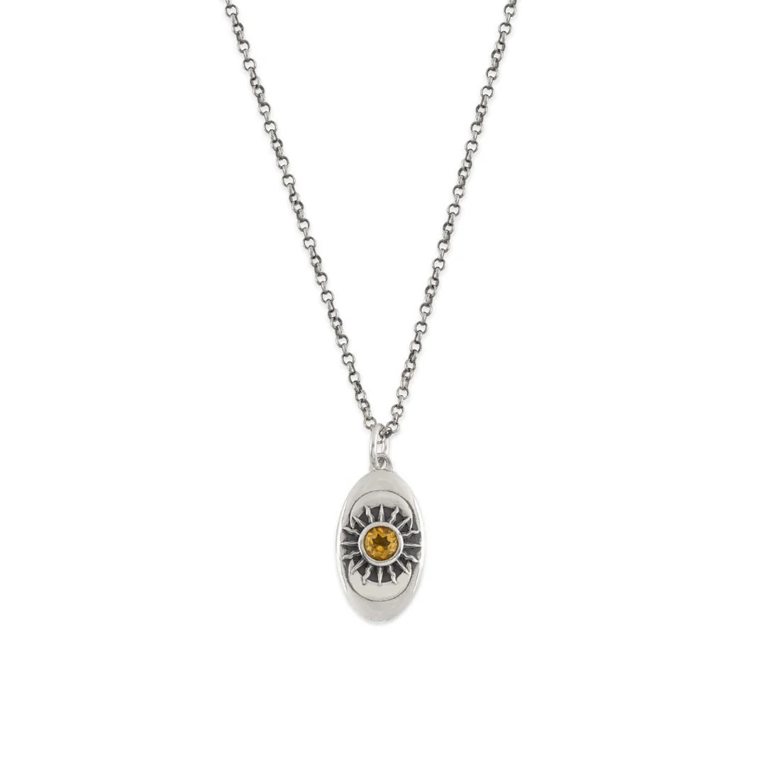 The Silver Helios Necklace is an oval shaped pendant with celestial style engraving and a natural Citrine stone. The necklace is made from 925 Sterling Silver and is hallmarked by Great British Assay Offices verifying its quality.
