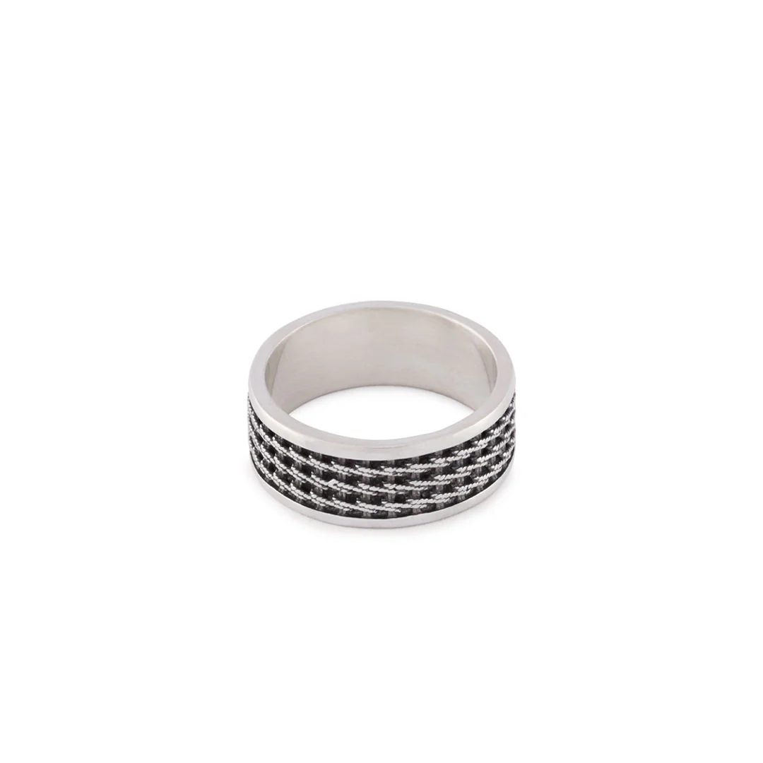 The word 'kusari' translates to 'chain', with the pattern detailing in this ring imitating that of a chain weave that can be found in armour.Ā The ring has an oxidised finish giving the dark, aged look behind the chain design.