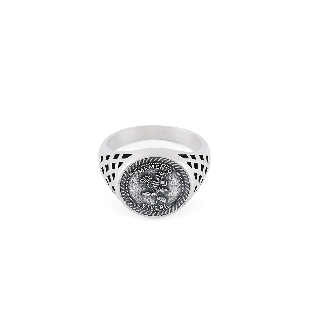 The Memento Ring is a statement sovereign ring featuring floral detail on the face surrounded with the quote "Memento Vivere" in latin which translates to "Remember to Live". The ring has an oxidised finish giving it an aged, vintage look which highlights the detailing.
