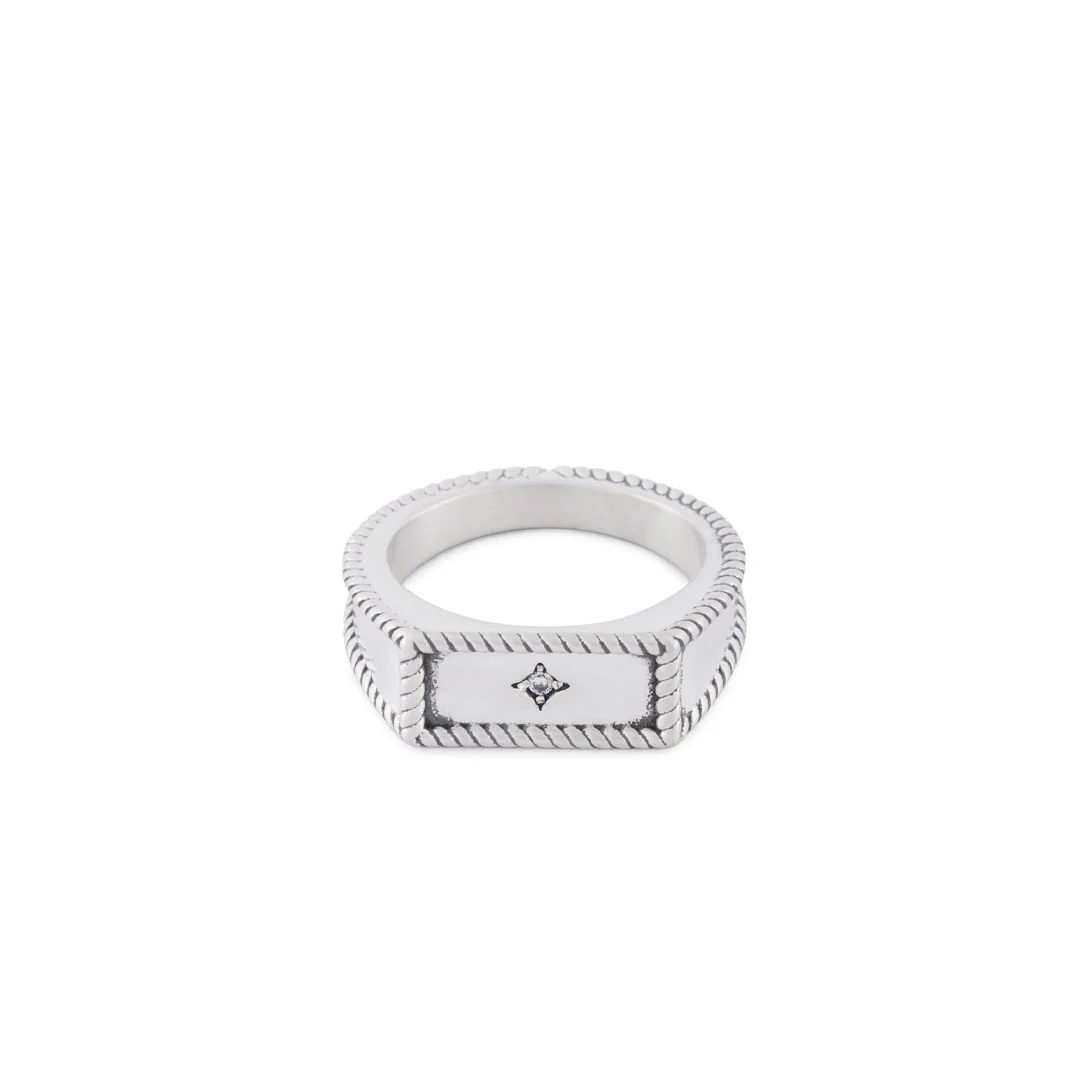 The Silver Moonlight Ring is a classic rectangle ring design with a star setting on the face and rope detailing. The ring is made from 925 Sterling Silver, and is hallmarked by Great British Assay Offices verifying its quality.