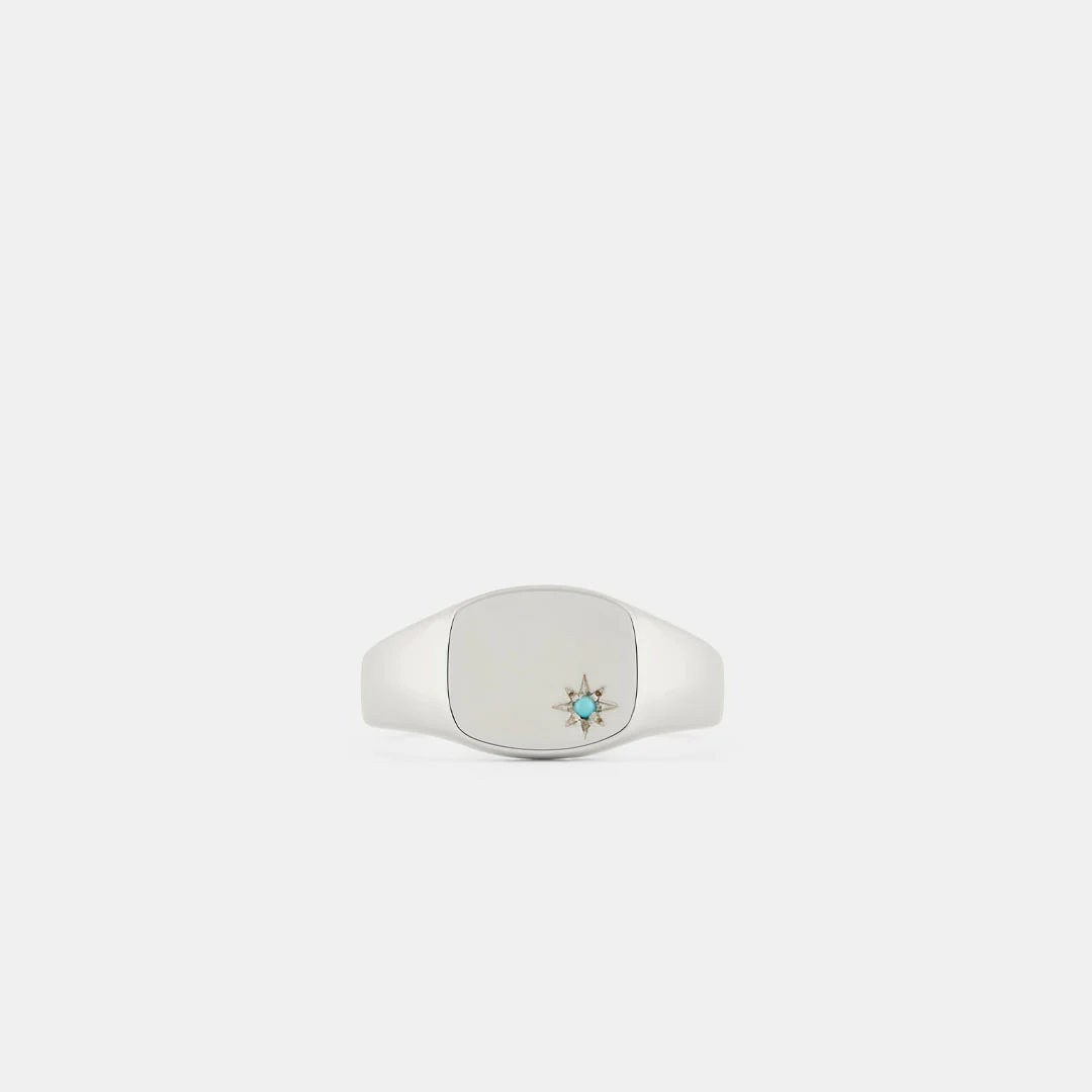 The ring has a soft square face which curves into shapely shoulders that wrap around the finger into a thick band making it a strong and sturdy every day ring. The bottom corner of the ring face has an engraved star setting which holds a natural, bright blue Turquoise gemstone. Turquoise is the birthstone for December birthdays and is traditionally given as a gift for 11th Wedding Anniversaries. Turquoise is a stone that brings good luck, heals old wounds, and brings fortune. It is also known for giving you courage, strength, and a calmness of mind.
