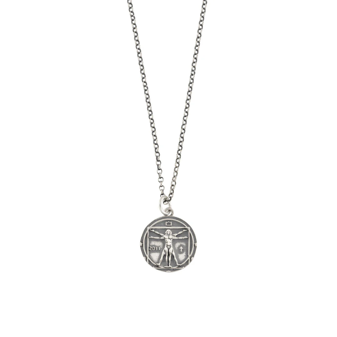 The 17mm pendant features the drawing of the 'Vitruvian Man' by Leonardo Da Vinci. The artwork depicts a man in two positions with his arms and legs apart and inscribed in a circle and square, based on Leonardo's concept of ideal human body proportions. Above the outline of the man is the Crown, one of the original Serge DeNimes 4 symbols. On one side is a Cross, another of our logos, and on the other side is '2011', our founding year. The necklace has an oxidised finish, giving it an aged, vintage look which highlights the detail on the pendant.